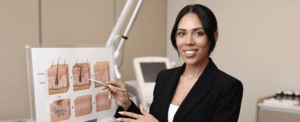 מומחית מוסמכת מבצעת הערכה מקצועית לפני הסרת מיקרובליידינג