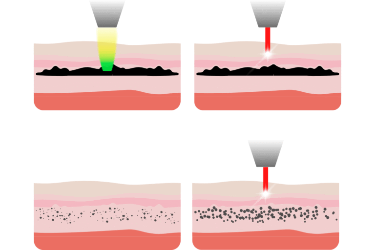 סוגי הלייזרים להסרת קעקועים: לייזר באורך גל 1064nm – נועד לטפל בקעקועים כהים, לרוב משתמשים בו לכחול כהה, חום כהה ושחור. לייזר באורך גל 532nm – נועד לטפל בקעקועים צבעוניים, לרוב חום בהיר, אדום, כתום, צהוב ומעט מהטורקיז.